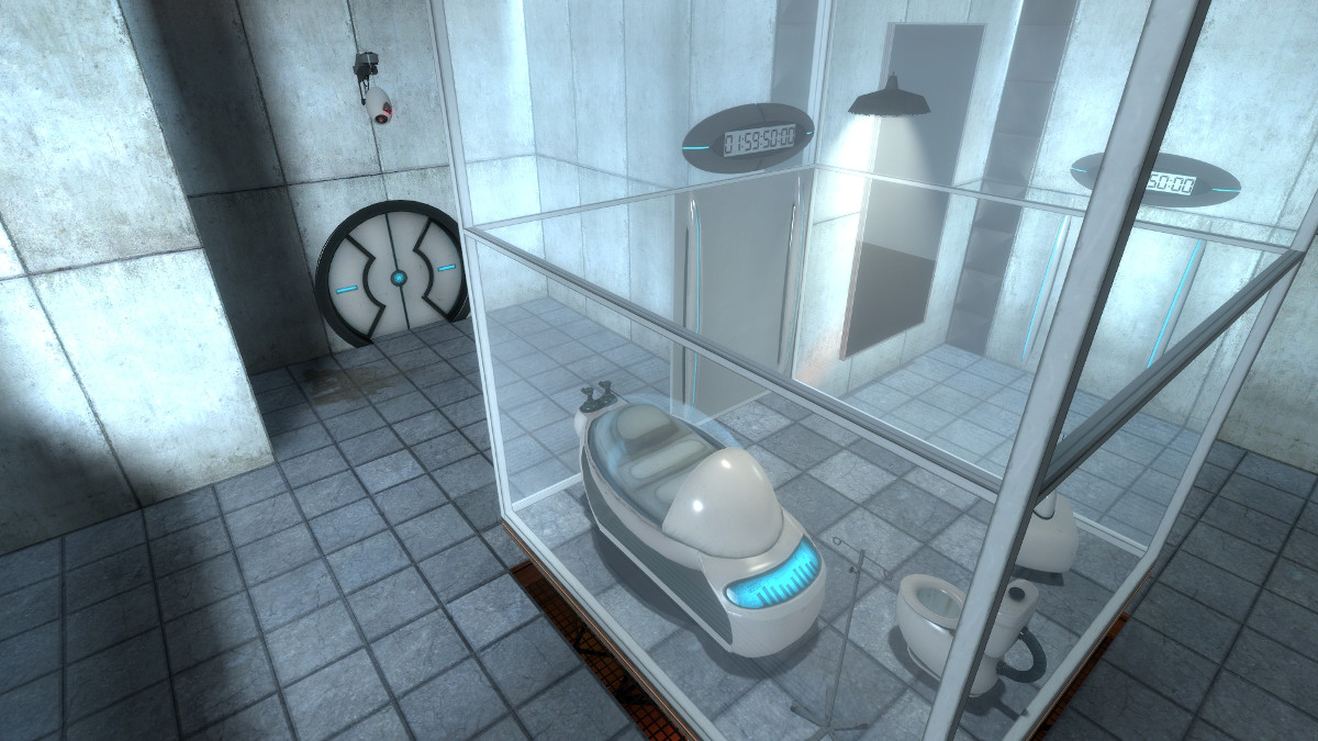 You wake up in an isolated glass cube of a room, surrounded by a chamber of dirtied white panels, a blurred window on the wall revealing a viewing room, but with no other living person to be seen within. The idle tune of the radio in your doorless room is suddenly drowned out by a robotically deadpan voice who welcomes you to the ‘Aperture Science computer-aided Enrichment Center’ and begins explaining that you are ready to begin testing.