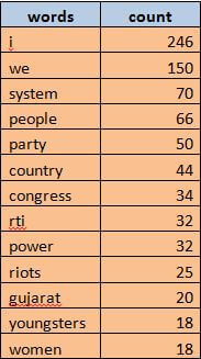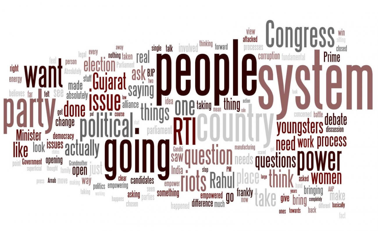 In the table on the right we have listed the words that Rahul Gandhi used most. If we negate the first two on the list, we see that the interview seemed to centre around the theme of people vs the system. Rahul addressed the issues of the system; acknowledged that people get hurt and that they are not heard. He said that he wants to change this system and open it up, make it transparent. Essentially he seemed to be saying the fight is between the people and the system.