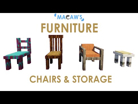 - Macaw’s Furniture adds in a ton of furniture items. Chairs, tables, stools, bookcases, and most of them can actually be used to sit in